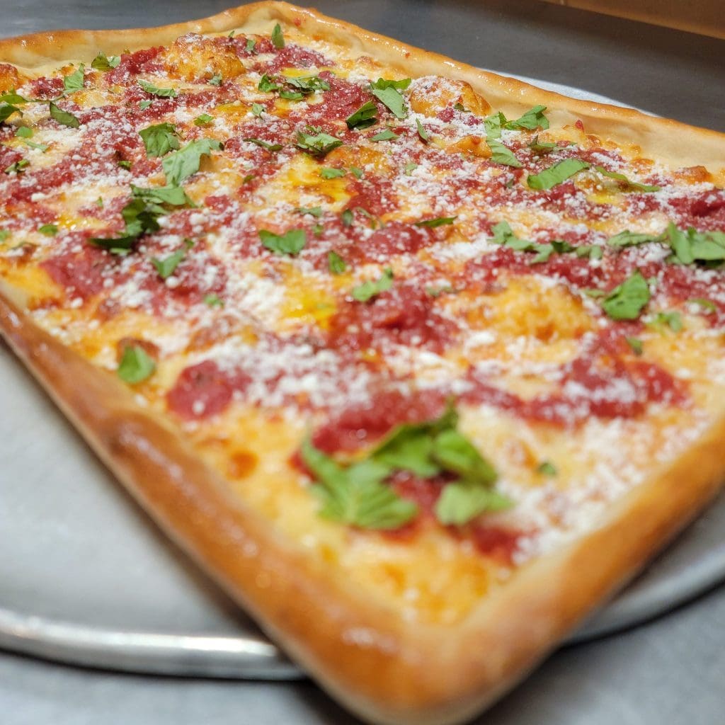 Unlike standard pizzerias, the pizza dough here is baked in a bakery known for its incredible bread, resulting in a hearty Sicilian crust. These square pizzas are light and airy, with perfectly charred edges.